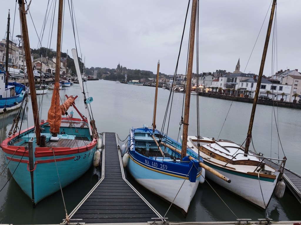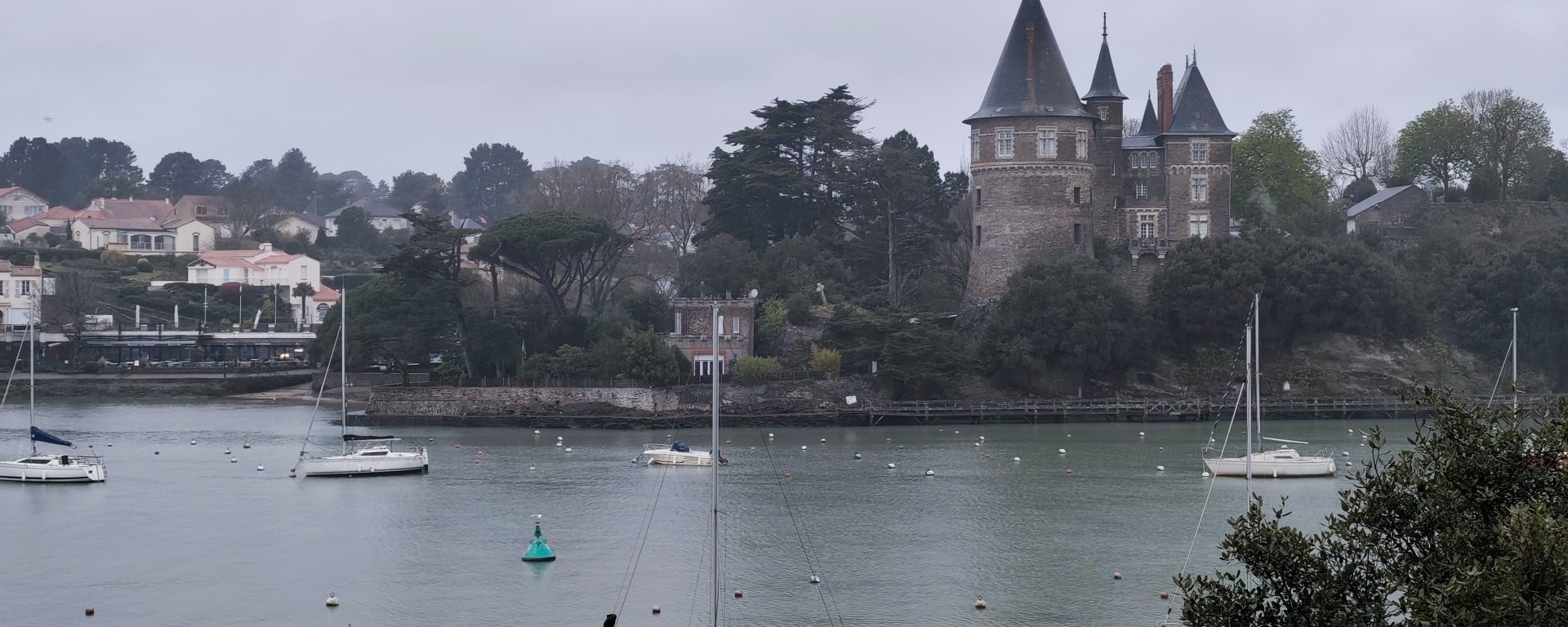 Instead of arriving by train, we could have sailed down the Loire River—which runs through Nantes (the city featured in last week’s blog post)—out to the Atlantic Ocean and onward to today’s two destinations. To the south, we’d read that Pornic was “a classic seaside resort town,” with its harbor, beaches, and coastal walks offering a relaxed atmosphere and beautiful scenery. North of there was Le Croisic, a working port town that “provides a more rugged coastal experience,” as you might expect from a fishing harbor and wild coastline. Despite their differences, both towns charmed us, each offering a distinct experience within a similar coastal theme.