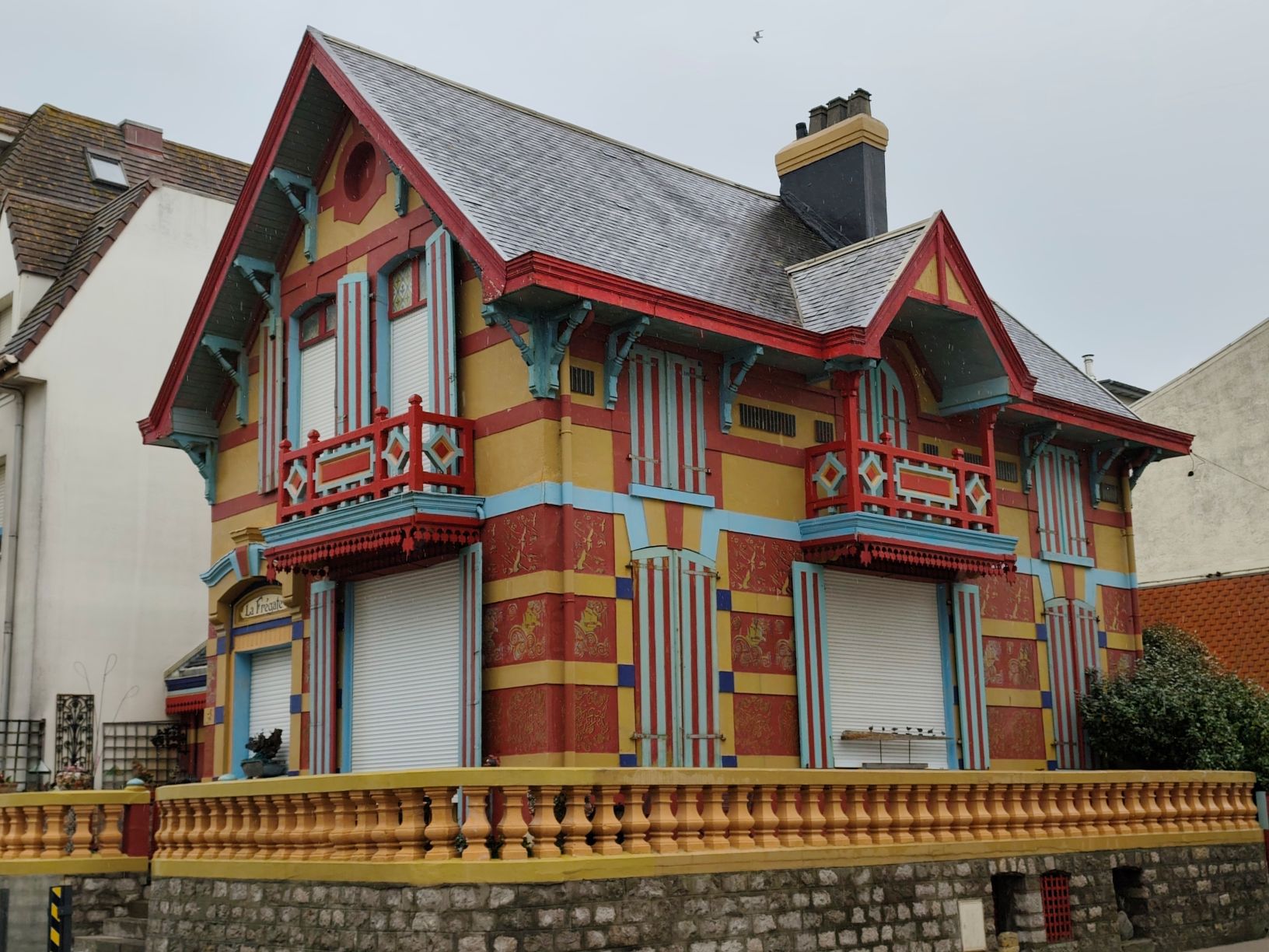 Given that it was only a 6-minute train ride to Wimereux, known as an “elegant seaside resort, perfect for those looking for a relaxing beach holiday and beautiful architecture” we easily decided to go there for a look around. The only photos of the town that we had seen were taken during winter storms when waves from the North Sea were splashing above the protective seawall. Even in those, however, the charm of the seafront was still evident and that’s exactly what we found as we strolled along the boardwalk and on the streets behind admiring the villas.