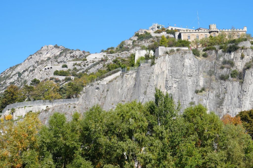 Since we were already in the Alps, the logical place to start the tour was a spot high above the city. To get up 263 meters/863 feet (about 80 stories) to the fort on top of the Bastille mountain, there are two options: walking uphill for an hour over pathways, steps, and a spiral staircase or riding the aerial tramway for 4 minutes. Once you’ve paid the 9.60€ roundtrip fare, you’re treated to 360-degree views from the “bubbles”, the nickname for these round plexiglass cars that replaced the more traditional ski lift cabins that started service in 1935. The military fortification at the top was largely constructed in the 19th century, although fortifications on the site date back to the 1500s.