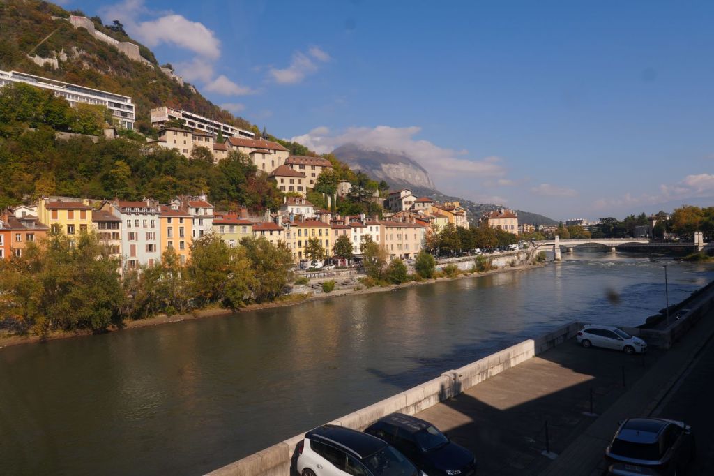 When we’ve been in major US cities such as Denver, Phoenix, and Las Vegas, I was always fascinated by standing on the sidewalk downtown and being able to see the mountains in the distance. Even when we lived in Los Angeles that worked for the San Gabriel range, on a clear day, of course. In Carcassonne we can get a good view of the Pyrenees when we’re over in the medieval walled cité, as the photo in this paragraph illustrates. The view from above the Isère river—a scene like the one in the featured photo across the top above, which Bill would eventually capture himself—was all the motivation we needed to visit Grenoble.