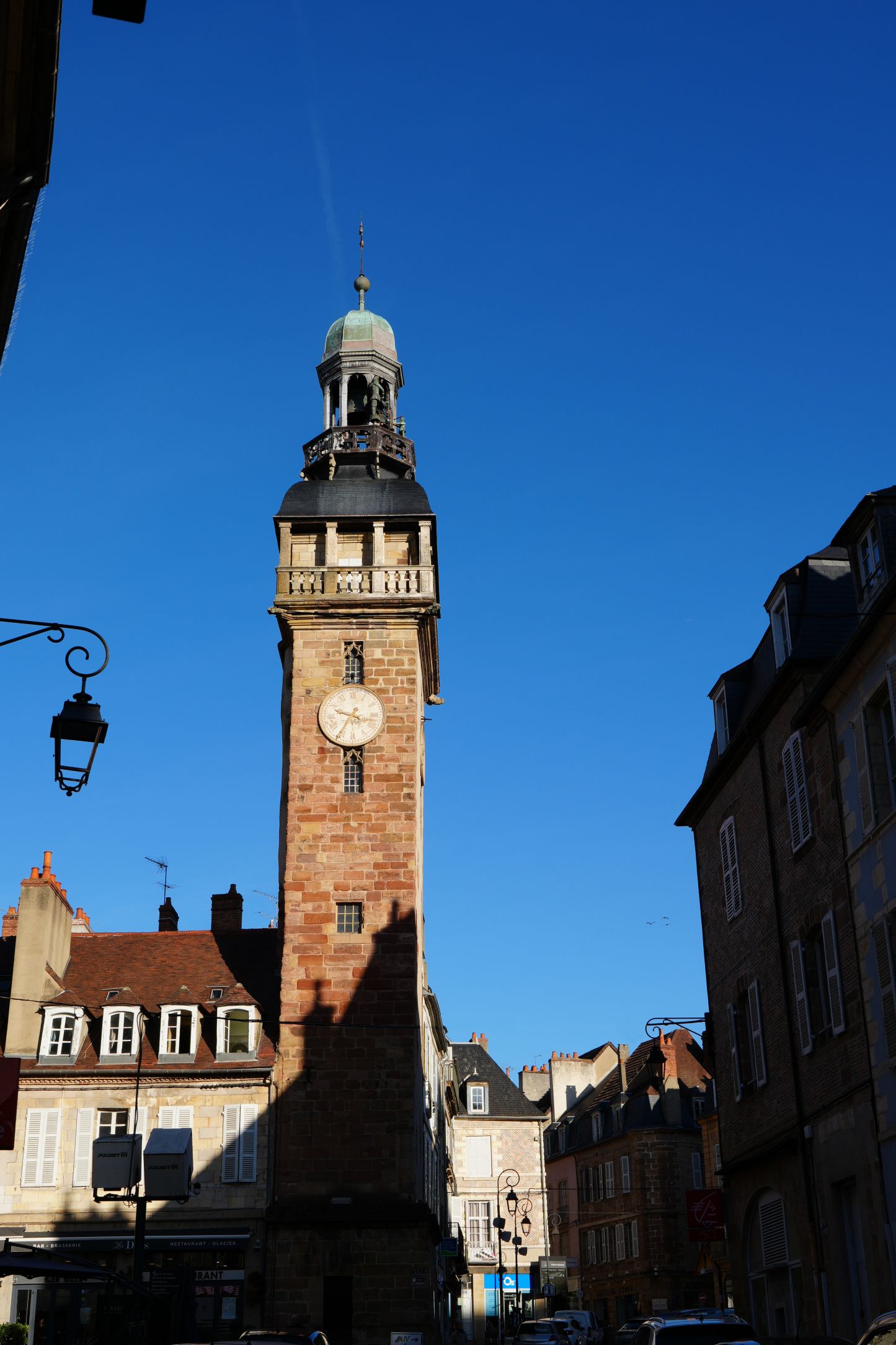 In only half an hour on the train back towards Vichy we were in Moulins-sur-Allier named for the mills (moulins) that once lined the Allier river. Little remains of those grain grinding machines that lasted from at least the year 990 until 19th century steam power and then electricity took over. Enriched by the wealth of its mills, the city became the seat of the Dukes of Bourbon beginning in the 14th century. Two towers are still standing from that period: the half-timbered Mal Coiffée Keep from the Ducal medieval castle and the Jacquemart Tower, once part of the city’s walls and gate, that still has its automated figures that chime the hour.