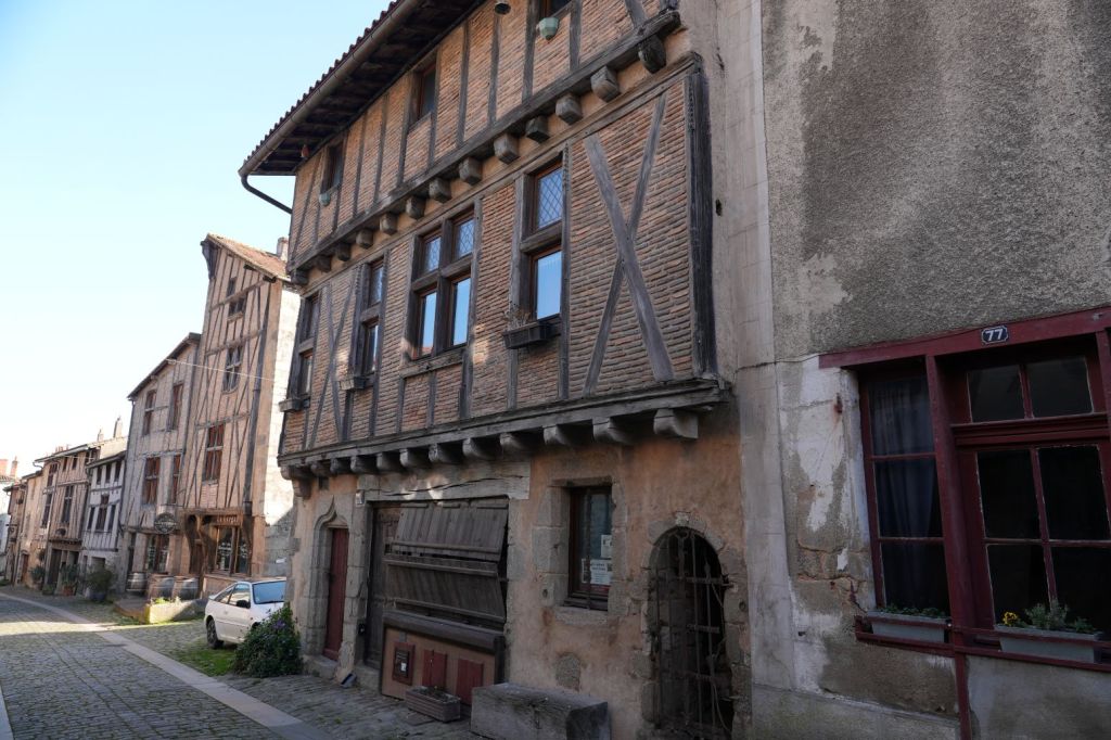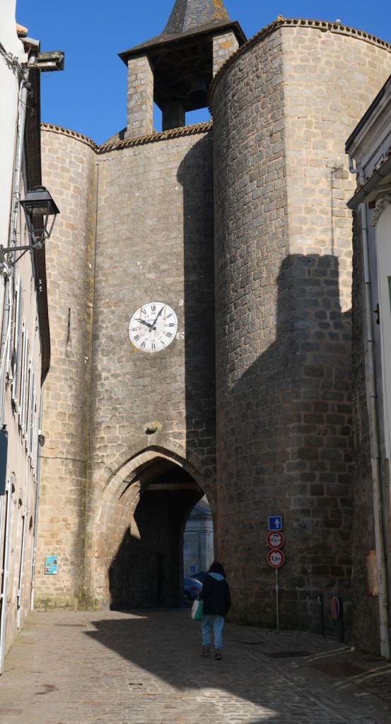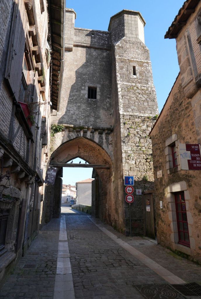 While time has not been kind to those 5 castles of Chauvigny, our next destination was more like disappearing into the Middle Ages. To enter Parthenay, we crossed over the 13th-century bridge Pont Saint Jacques and then stepped through its like-named, heavily fortified gate, Porte Saint Jacques, passing the iron and wooden grille plus the “murder hole” through which rocks were dropped on any invaders. Safely inside, we were greeted with cobblestones and the half-timbered houses of the narrow street, rue de la Vaux-Saint-Jacques, the photo in the 1st paragraph. That name appears so often because we were on the Way of St. James (Saint-Jacques) that pilgrims have been following towards Santiago de Compostela, Spain for centuries.