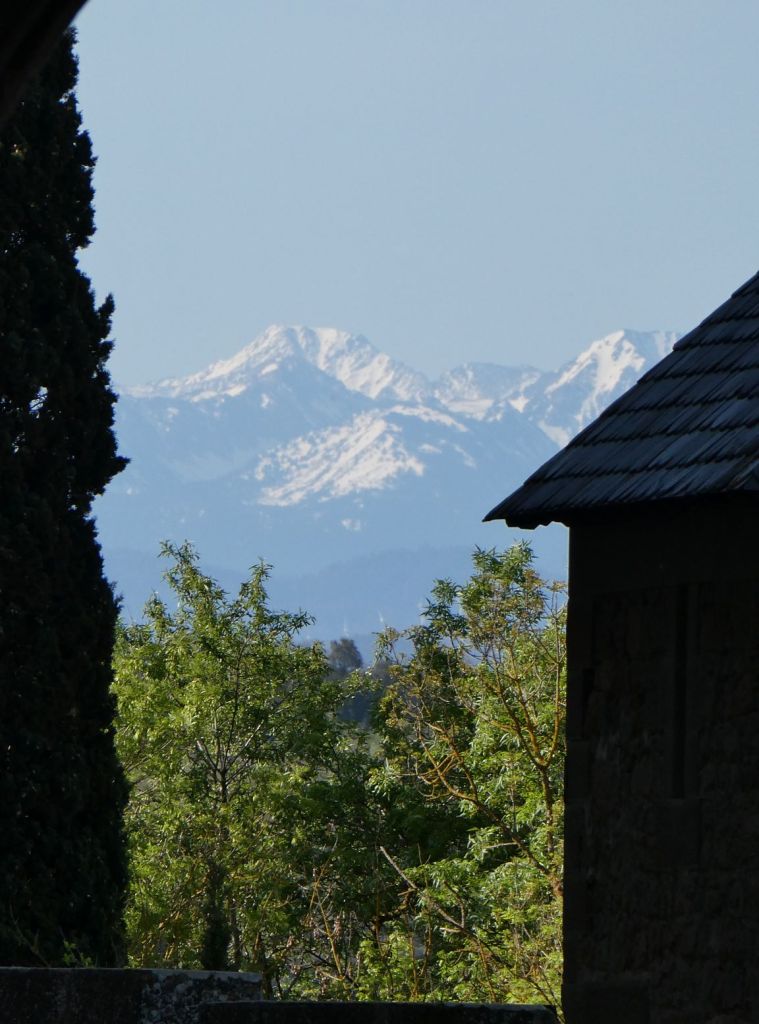 When we’ve been in major US cities such as Denver, Phoenix, and Las Vegas, I was always fascinated by standing on the sidewalk downtown and being able to see the mountains in the distance. Even when we lived in Los Angeles that worked for the San Gabriel range, on a clear day, of course. In Carcassonne we can get a good view of the Pyrenees when we’re over in the medieval walled cité, as the photo in this paragraph illustrates. The view from above the Isère river—a scene like the one in the featured photo across the top above, which Bill would eventually capture himself—was all the motivation we needed to visit Grenoble.