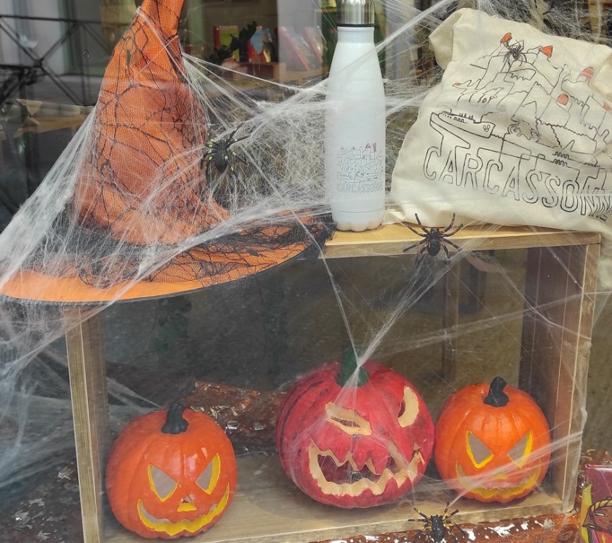 October 31st isn’t much of a holiday in France but it does seem to be growing in popularity. At the supermarket you might spot a few bags of miniature candy bars individually wrapped or as you can see in the accompanying photos, chocolate shops decorate their windows with sometimes creepy displays as did the tourism office (featured photo above). This year the city will be hosting scary stories this afternoon at the castle inside the walls and Chateau de Pennautier, just outside of town (photo and link below), got dressed up for the occasion too. This will be our sixth Halloween here and we’re expecting the usual number of trick-or-treaters that we see every year: between zero and one. For us it’s just an excuse to buy a bunch of Snickers. That aside, I wanted to see what, if any, history All Hallows Eve had in France and if they had anything similar over the years. Thanks to the website My Parisian Kitchen I found some answers.